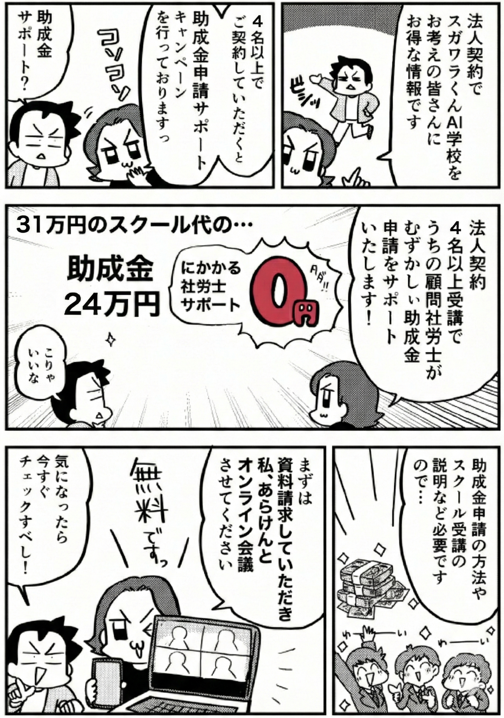 AI活用支援サービス「スガワラくんAI学校 税理士校」は、企業のAI導入から運用までを包括的にサポートし、その使い方を段階的に指導していくオンライン研修です。